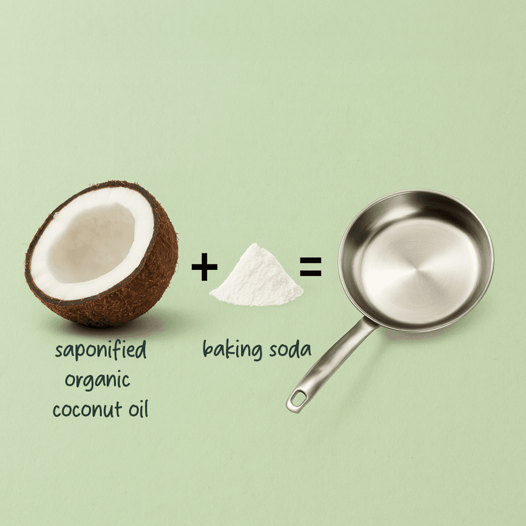 Only two ingredients: organic saponified coconut oil and baking soda — ingredients chosen for effectiveness, not marketing.